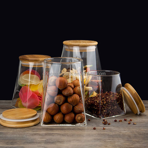도매 사용자 정의 방진 수제 사각 바닥 라운드 오픈 붕규산 유리 식품 저장 항아리 대나무 뚜껑
